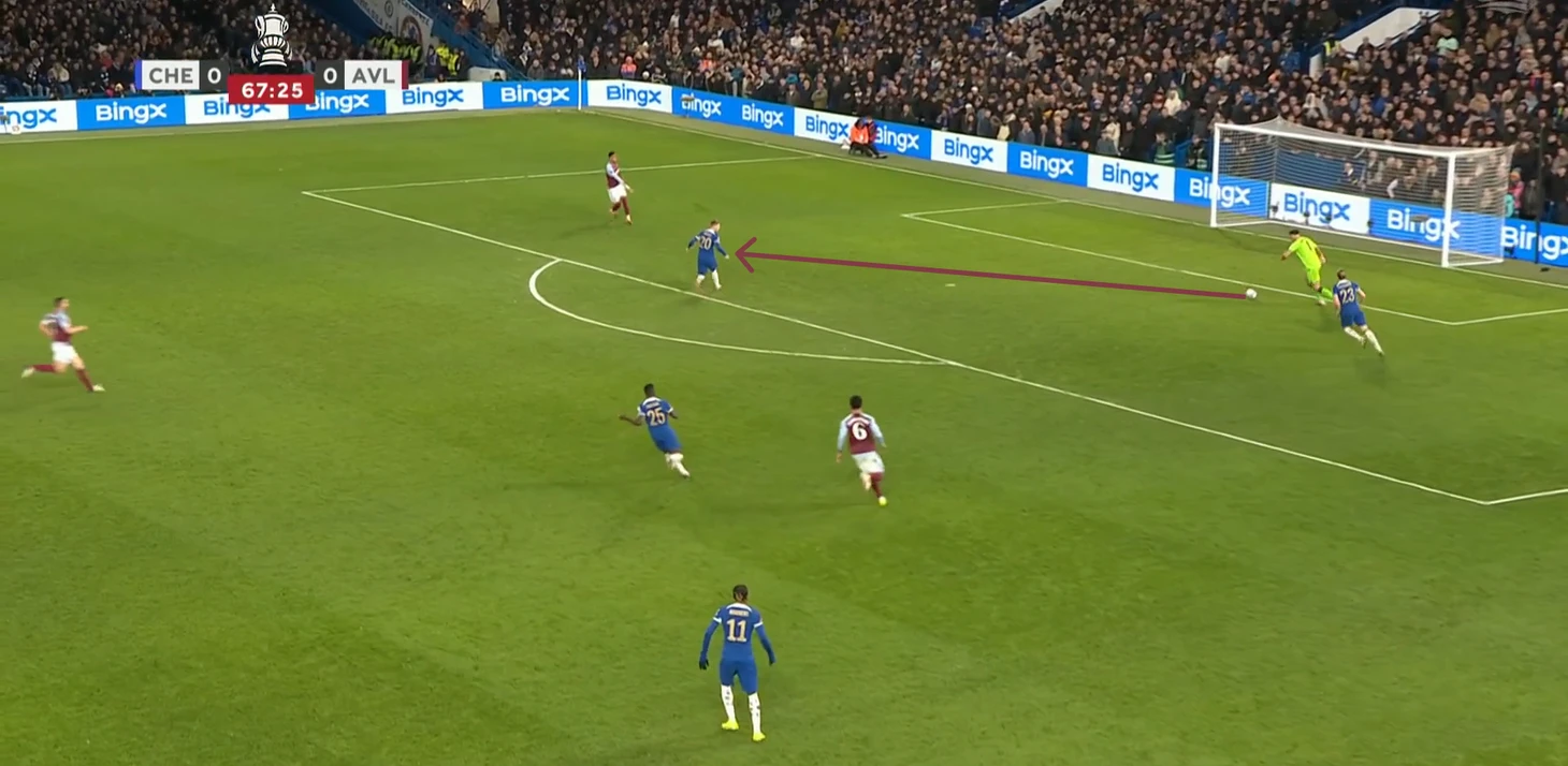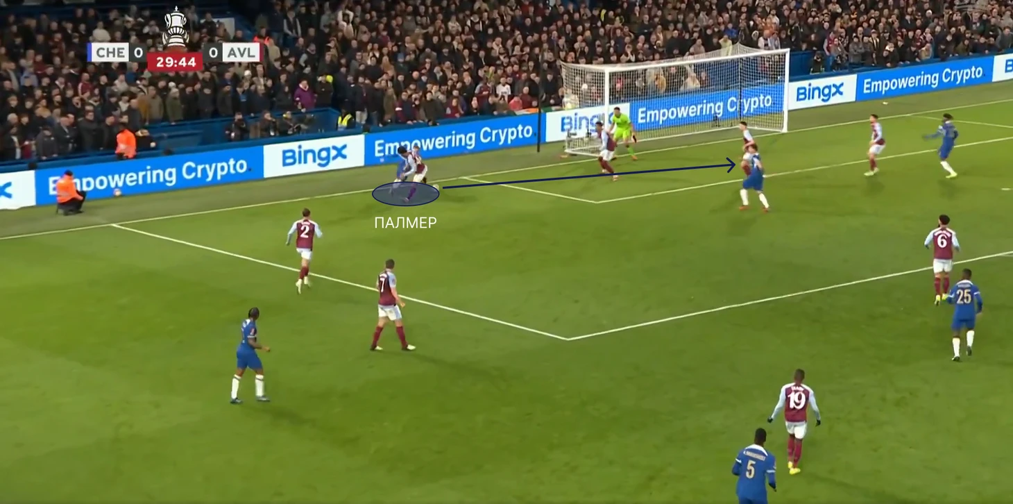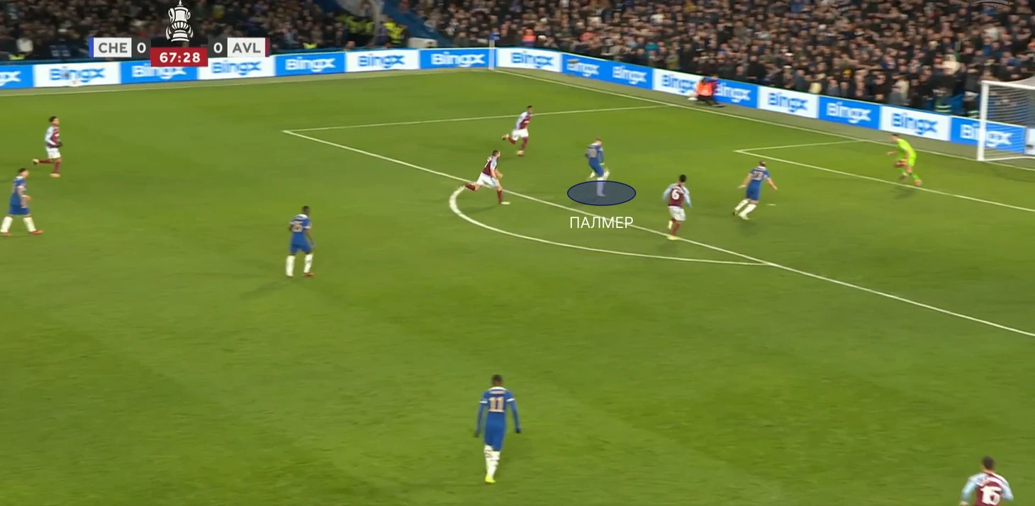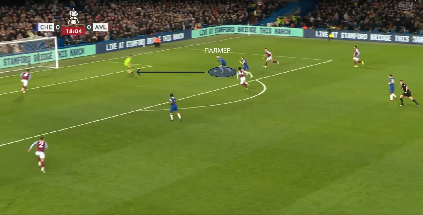 Челси продолжал давить на Астон Виллу, и тут прослеживается одна деталь, которая приводит аргумент в пользу позиции Палмера в этой игре – перехваты у чужой штрафной. Вспомните матчи с Боро, где Коул читал передачи защитников, во время начала их атак. Так и здесь – Челси активно прессинговал защитников Виллы, вынуждая Лангле отдать рискованный пас на Мартинеза, но Палмер прочитал эту задумку, создав один из опаснейших моментов матча. Но англичанина снова подводит реализация. Таким образом, Мартинез за 5 минут дважды спасает свою команду.