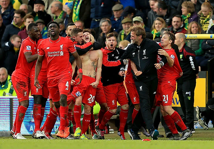 Лаллана забил на 95-й, и «Ливерпуль» выиграл у «Норвича» 5:4. Игроки побежали к тренеру и отпраздновали с ним так, что очки сломались.