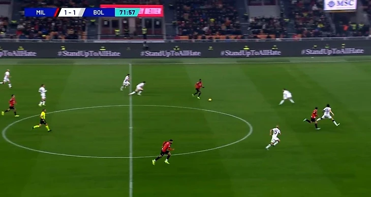 «Милан» в очном матче выставил оптимальный на данный момент состав. Команда Пиоли в своей игре прежде всего делает акцент на стремительном преодолении центра поля: «Болонья» учла это и выпустила состав с пятью(!) номинальными центральными полузащитниками. Фаббиан и Урбаньски в этой расстановке закрывали левый и правый фланги в средней линии, соответственно. На этом фоне «Болонья» не отказалась от привычного насыщения «второй» линии розыгрыша мяча за счет смещений центральных защитников. Риккардо Калафьори и Сэм Бёкема в билдапе обычно поочередно поднимаются выше, тем самым предлагая партнерам дополнительный вариант для паса. Пиоли прочитал этот ход и велел Оливье Жиру следовать за Бёкемой персонально. В дальнейшем голландец реже предлагал себя в центре поля, эти функции почти безраздельно отошли Калафьори, который в среднем по сезону чаще партнера выполняет передачи с продвижением и регулярнее «ходит» с ним вперед.