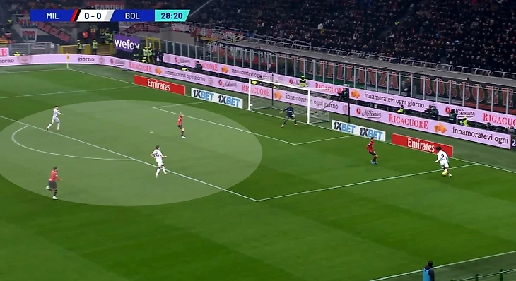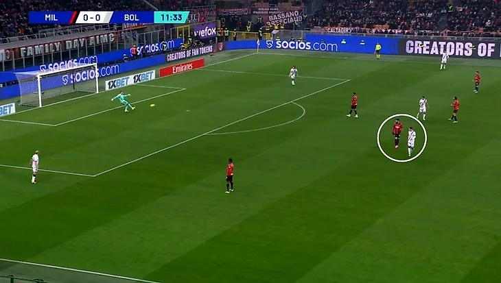 «Милан» ожидаемо активно задействовал левый фланг, но до поры Тео и Леау не могли наладить взаимодействие, привычные обмены позициями. Виной тому — внимательная игра полузащитников «Болоньи», чаще всего, Фаббиана и Эбишера, которые нивелировали угрозу, поочередно встречая соперников и страхуя друг друга. Лишь на 19-й минуте «Милану» удалось по-настоящему напрячь правого защитника гостей Де Сильвестри: Леао в контратаке получил немного пространства, вошел в штрафную и пробил — спас Скорупски. Это был единственный момент у португальца за тайм. В те минуты хозяева взвинтили темп и стали прессинговать особенно активно, доводя давление до вратаря «Болоньи», который при Тиагу Мотте обязан разыгрывать накоротке. Скорупски же не рисковал под прессингом и не постеснялся несколько раз подряд выбить мяч вдаль. «Болонья» выдерживала натиск, однако об атаках не помышляла. Команда верит в свой стиль, в осмысленные розыгрыши мяча накоротке и старается не отказываться от них, но такой сильный соперник, как «Милан», способен повлиять на игровой план. Только в одном матче чемпионата по ходу сезона «Болонья» набрала меньше коротких передач, чем в тот вечер на «Сан-Сиро»: