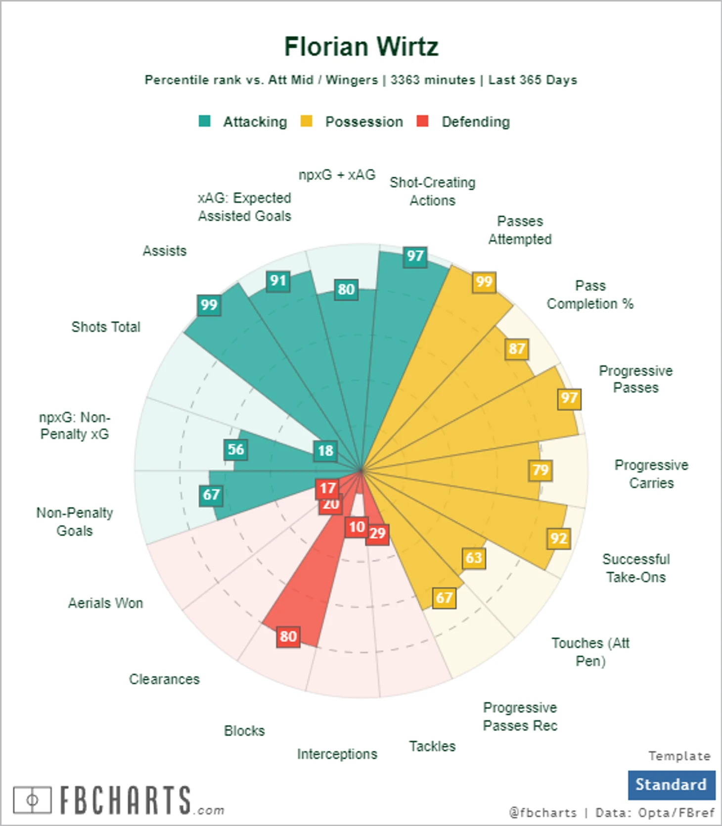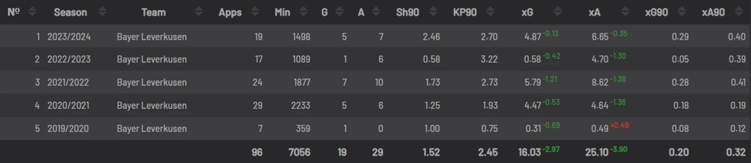 Флориан не по годам умён, зрел и опытен – в свои двадцать он уже отбегал 129 матчей в футболке леверкузенцев во всех турнирах, а в 2023-ем стал лидером топ-5 лиг по числу ассистов – их у него 18. Ниже пытаюсь разобраться в краеугольных аспектах качественного роста Вирца, сравниваю ключевые метрики немца, анализирую его выступления по сезонам и провожу аналогии с другим талантом Бундестим.