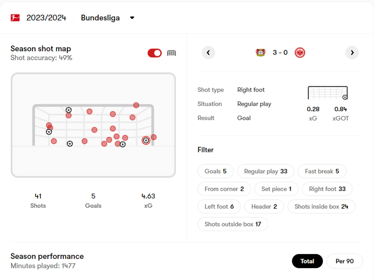 Отмечу, что наш герой выстрелил аккурат незадолго до разрыва «крестов». В сезоне 2021/22 (Флориану было всего 18) он шёл по великолепному графику: 7+10 в 24 матчах; наибольшее за карьеру среднее число ударов (повысил планку только в этом сезоне); средний персональный xG – 0.28 (сейчас 0.29), а xGA и вовсе лучший за карьеру – 0.41.