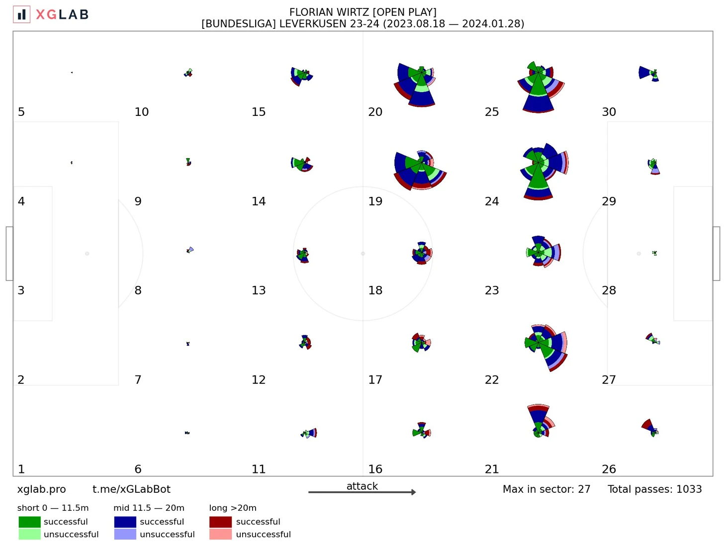 Видно, что в секторе «Владение» у Флориана всего два значения меньше 70 – количество касаний в штрафной (63) и Progressive Passes Rec (21). Последняя метрика, к слову, является и вовсе довольно спорной, так как смотреть на неё в отрыве от Progressive Passes (97) не имеет смысла. Главное, что вингер умеет и любит делать передачи с продвижением, причём делает это из любой позиции: либо находясь в отправной точке билд-апа (да, бывает и такое – Вирц садится очень низко); либо на чужой половине.