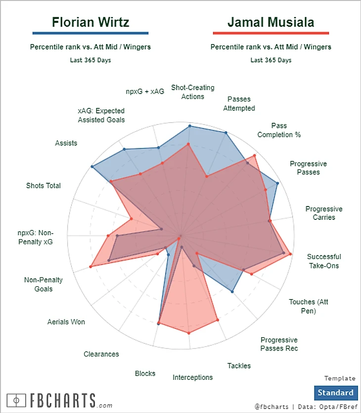 Параллельным курсом восходила звезда Джамала Мусиалы, негласное противостояние с которым станет, на мой взгляд, одним из определяющих нарративов карьеры Вирца. Впрочем, ему, равно как и Джамалу, завуалированное соперничество лишь на пользу. Несмотря на условно схожее позиционное расположение, функционал у двух талантов заметно разнится. Причина – игровые характеристики. Если Вирц более контактный игрок, не чурающийся борьбы и наглого дриблинга даже против грубых опекунов, Мусиала – юноша с более тонкой душевной организацией, для которого подыгрыш партнёру зачастую становится важнее индивидуальных действий. Справедливости ради, Сане, чрезмерно тянущий одеяло на себя, в этом сезоне чуть ли не силком отбирает мяч у Джамала, мягко говоря, не прибавляя очков к его уверенности.
