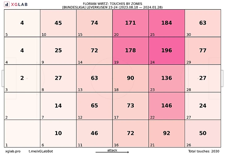 Карта касаний нашего героя – самая иллюстративная презентация его игрового стиля. Виден объём покрытия, который не может не впечатлять. Вирц старается отметиться универсализмом как при игре с мячом, так и без него. В высокоинтенсивном позиционном футболе Алонсо он, очевидно, и есть главный проводник тренерских идей на поле: широкий диапазон игровых зон; чёткое следование стратегии «отдал пас – тут же поднялся выше»; умение исполнить роль инвертированного вингера.
