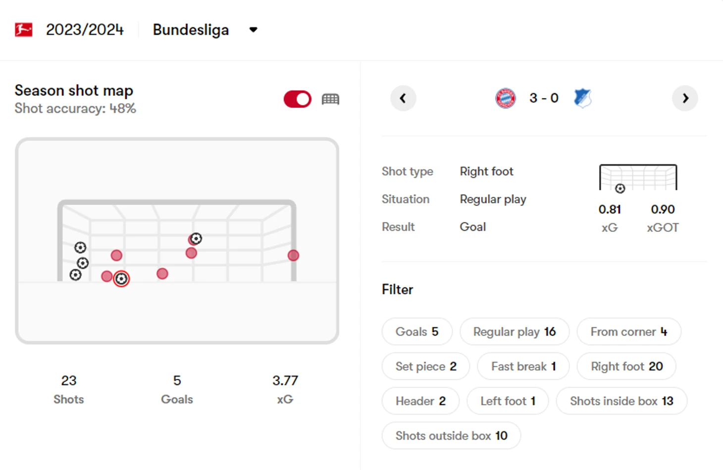 Видно, что двух вингеров роднит лишь количество мячей и точность ударов, в остальном – пропасть. Баварский вундеркинд, например, очень любит улучшать ударную позицию. Да и в принципе по нон-шотам и проникновениям в чужую штрафную дела у Джамала куда лучше, а около 22% его ударов становятся голами.