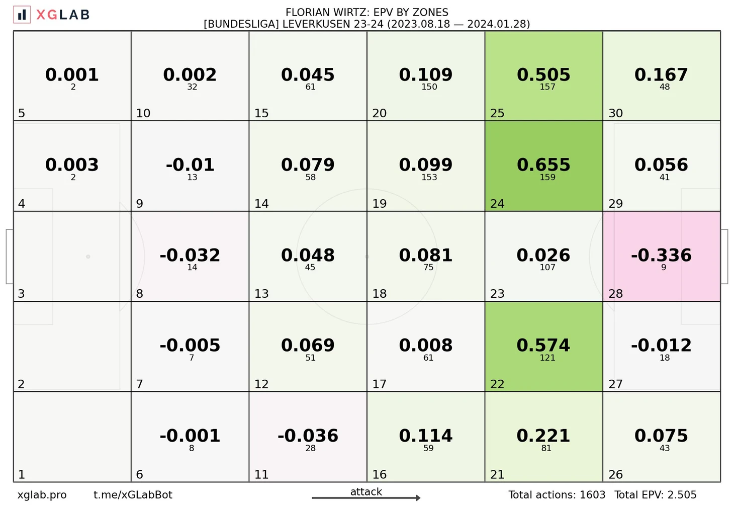 Общие котировки ценности владения мячом Вирцем совершенно не впечатляют. Взять для сравнения хотя бы показатели Гримальдо в матче с «Лейпцигом» (подробнее разбирал игру здесь), когда Алекс пробил отметку в 1.674! На их фоне совокупные 2.505 у Флориана выглядят довольно жалко, согласитесь. Именно поэтому метрику EPV, как наиболее коварную, я традиционно выношу в конец анализа, дабы читатель мог собрать пазл самостоятельно, наложив более релевантные показатели на менее. И в случае с Вирцем всё как раз объяснимо: вингер буквально разрывается между зонами, стараясь участвовать во всех переходных стадиях команды при атаке, а также помогая партнёрам при прессинге/обороне. От этого закономерно проседают показатели немца в самых хлебных зонах – атакующих. Зато в них оверперформят Гримальдо, Фримпонг и Джонатан Та.