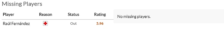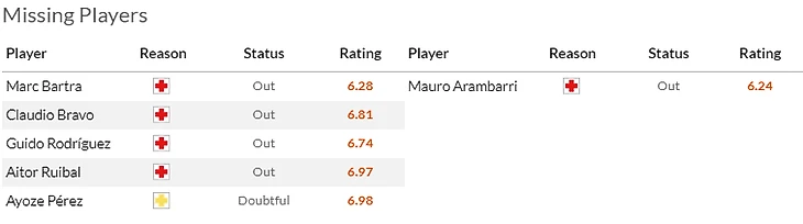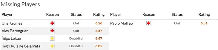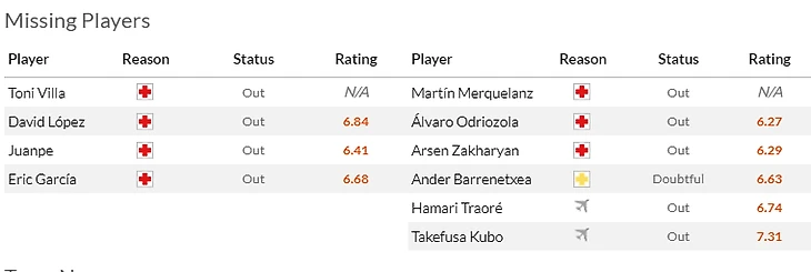 Также не помогут баскам гастролирующий в Африке Траоре(6), травмированные Тирни(6), Муньос(5,5) и Карлос Фернандес(6,5). Под вопросом участие в туре Захаряна(7) с Элустондо(6).Что касается хозяев, то здесь в общую группу вернулся Эрик Гарсия(6).