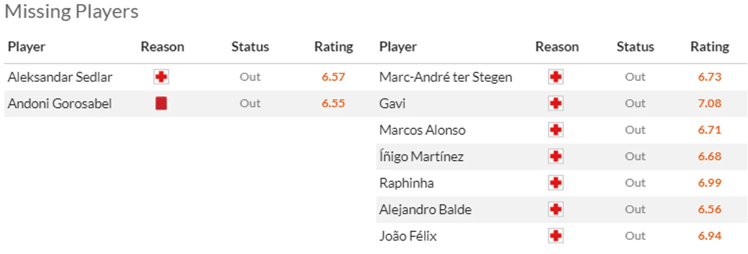 На что обратить внимание: На лазарет Барселоны, который в самый ненужный момент оказался переполнен самыми нужными игроками. На неделе к этому скорбному списку добавился еще и Ферран Торрес(8) который из-за мышечной травмы пропустит около месяца.