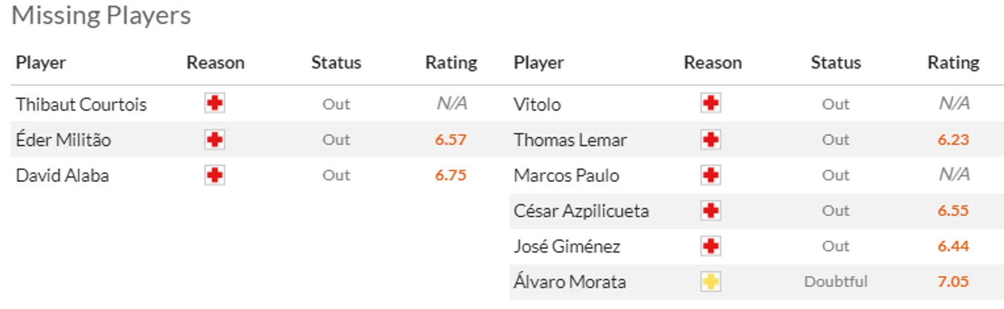 Что касается атлетов, то тут главная интрига – успеет ли восстановиться к дерби Альваро Мората(8,5). Испанец пропустил вынесенный матч с Райо Вальекано, но сохраняет шансы побегать на Бернабеу.