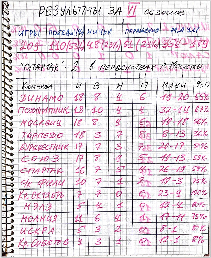 Все наши матчи записывал в тетрадку: голы с минутами, погода, состояние поля (по пятибалльной системе – за несколько лет «отлично» только пару раз попадается). За 6 лет сыграли 209 матчей – 110 побед, 48 ничьих, 51 поражение. 354 забили, 189 пропустили. Это против лучших клубных команд Москвы – «Динамо», «Торпедо», «Спартака», «Москвича», «Буревестника», «Союза».