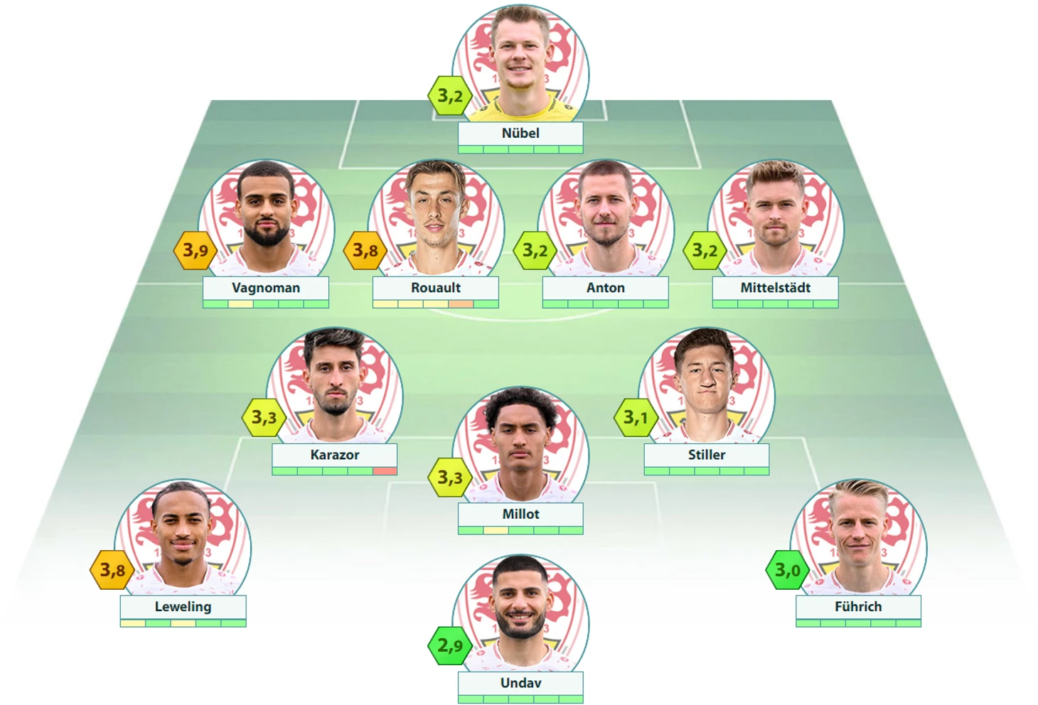 «Штутгарт»: Nübel - Vagnoman, Anton (c), Zagadou, Mittelstädt - Karazor, Stiller - Leweling, Millot, Führich - Undav