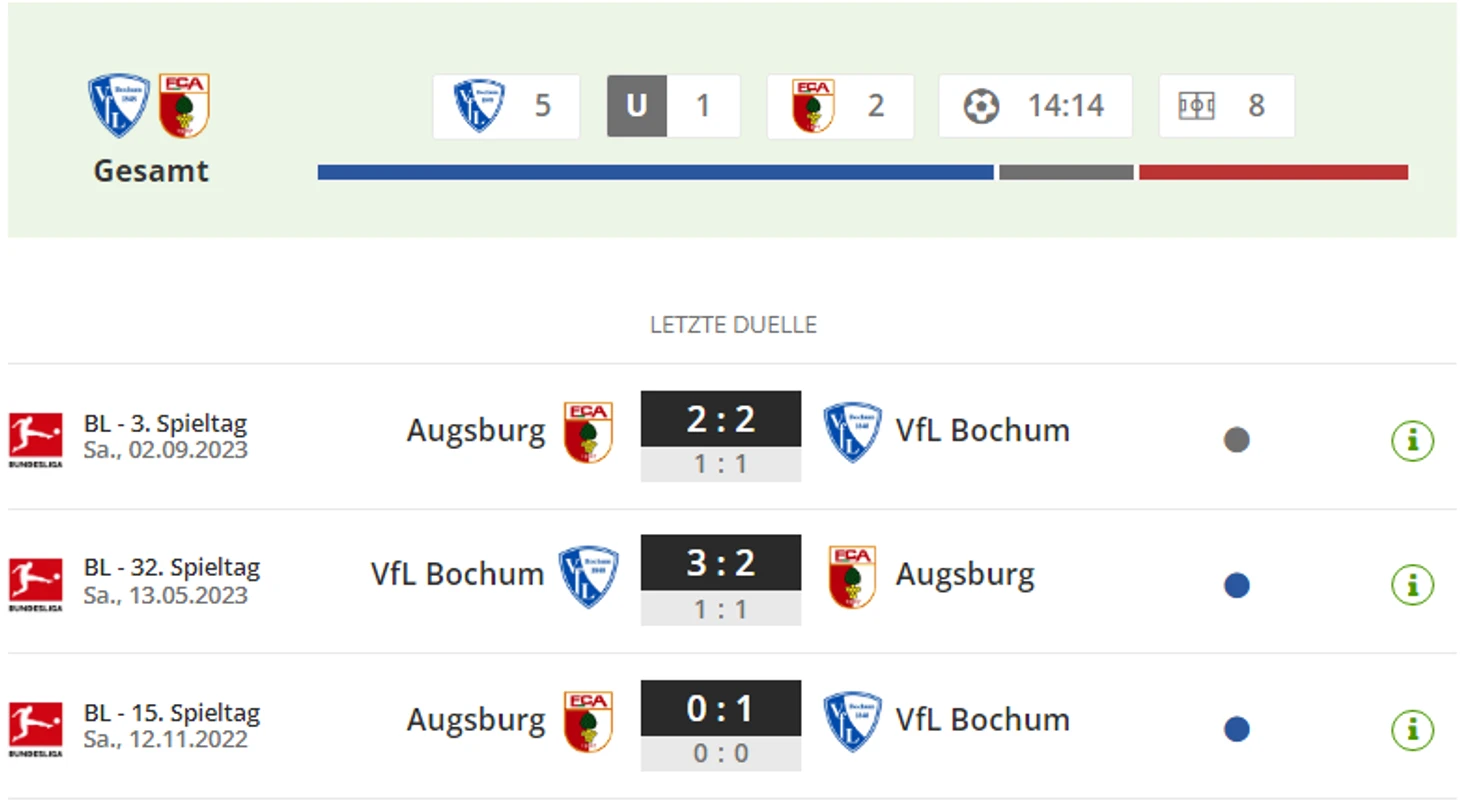 - У «Бохума» самый лучший показатель в Бундеслиге против «Аугсбурга»: в пяти поединках было три победы, одна ничья и одно поражение.