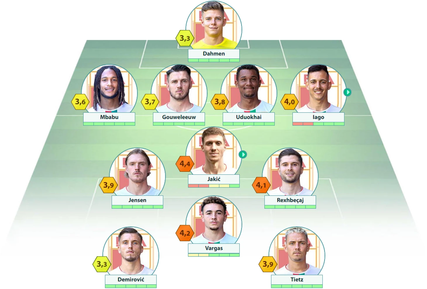 «Аугсбург»: Dahmen - Mbabu, Gouweleeuw, Uduokhai, Iago - Jakić, Rexhbeçaj - Jensen, Demirović (c), Vargas - Tietz