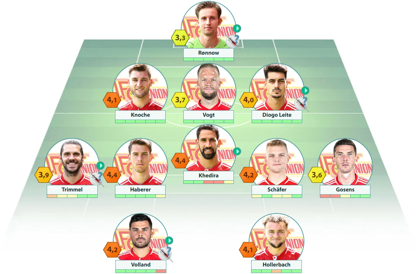 «Унион» Берлин: Rønnow - Knoche, Vogt, Leite - Král - Trimmel (c), Tousart, Schäfer, Gosens - Bedia, Hollerbach