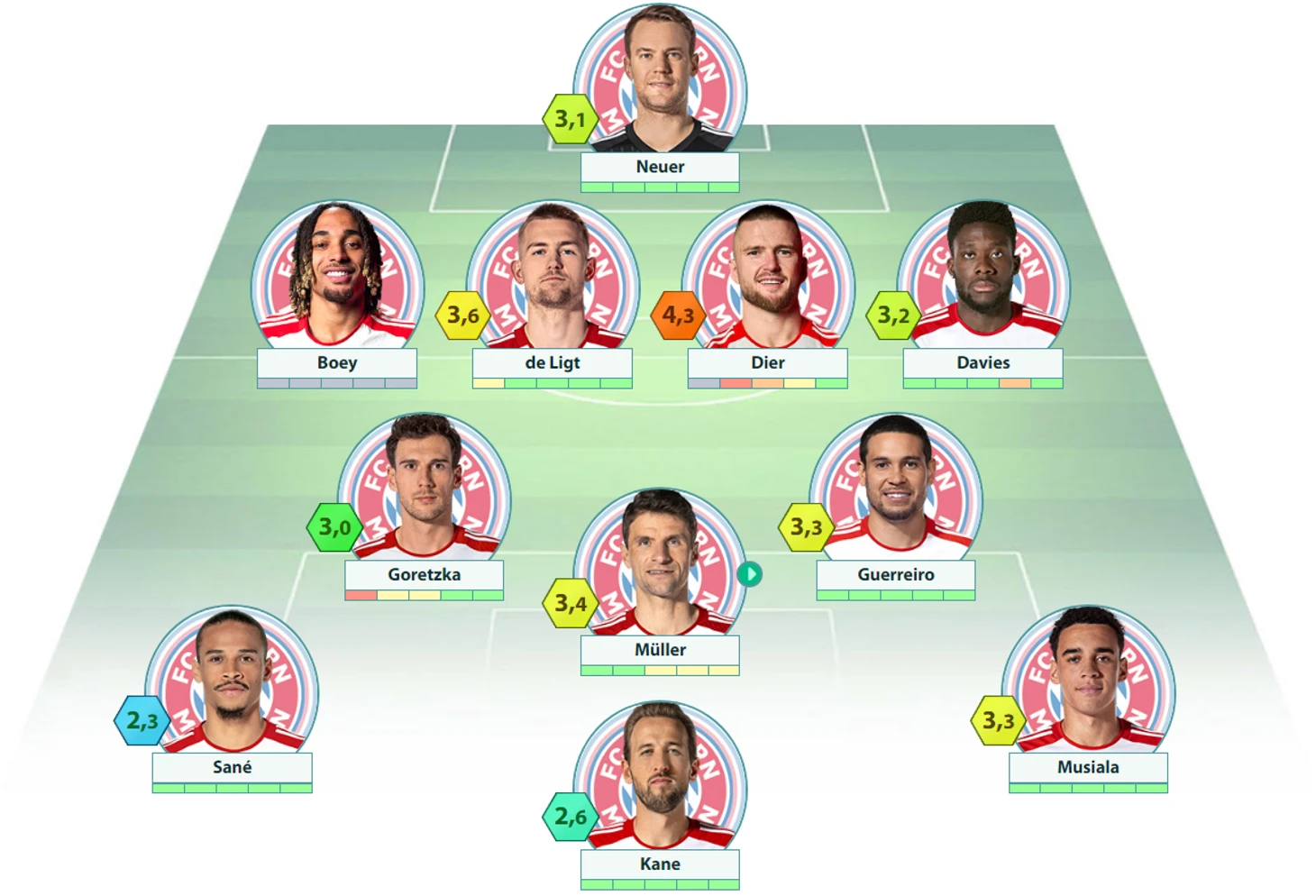 «Бавария» Мюнхен: Neuer (c) - Boey, Dier, De Ligt, Davies - Goretzka, Guerreiro - Müller, Musiala, Sané - Kane