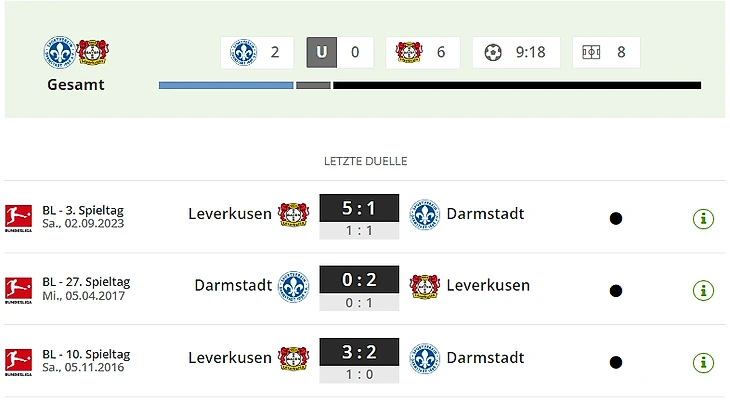 - «Дармштадт 98» — команда, которая дольше всех не выигрывает в Бундеслиге (12 матчей подряд), встречается с командой, чья беспроигрышная серия в чемпионате составляет 19 матчей к ряду — «Байер 04».