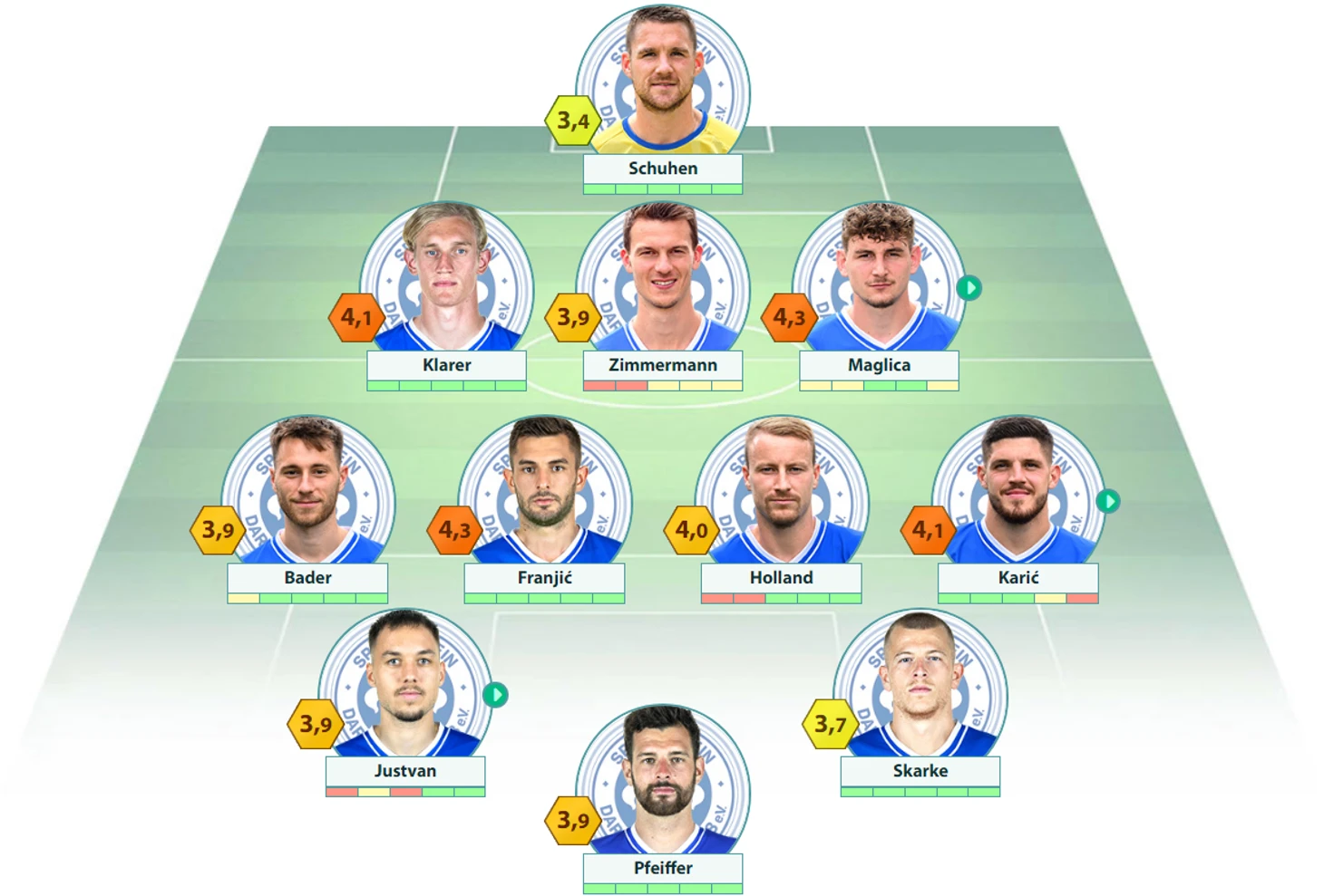«Дармштадт 98»: Schuhen - Zimmermann, Gjasula, Klarer - Bader, Franjić, Holland (c), Karić - Justvan, Skarke - Pfeiffer