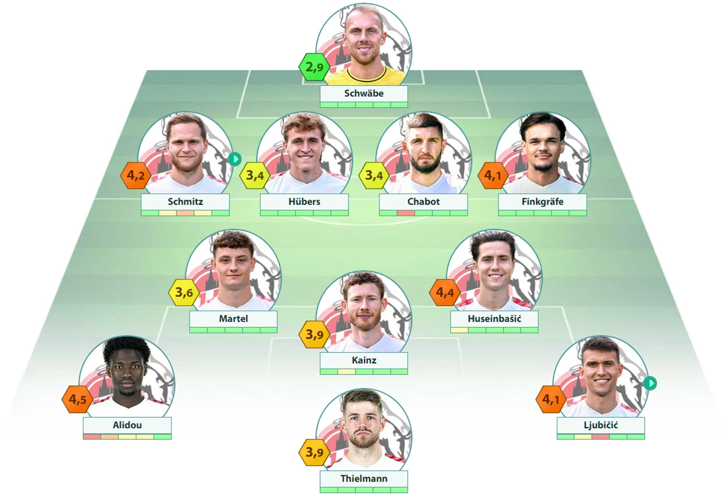«Кельн»: Schwäbe - Carstensen, Hübers, Chabot, Finkgräfe - Huseinbašić, Martel - Ljubicic, Kainz (c), Alidou - Thielmann