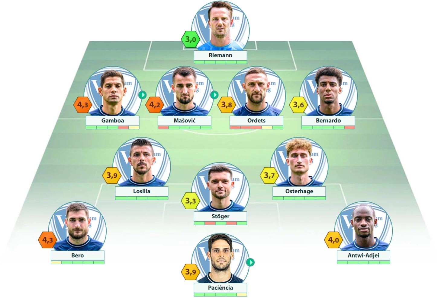 «Бохум»: Riemann - Oermann, Mašović, Ordets, Bernardo - Osterhage, Losilla (c), Stöger - Bero, Broschinski, Antwi-Adjei