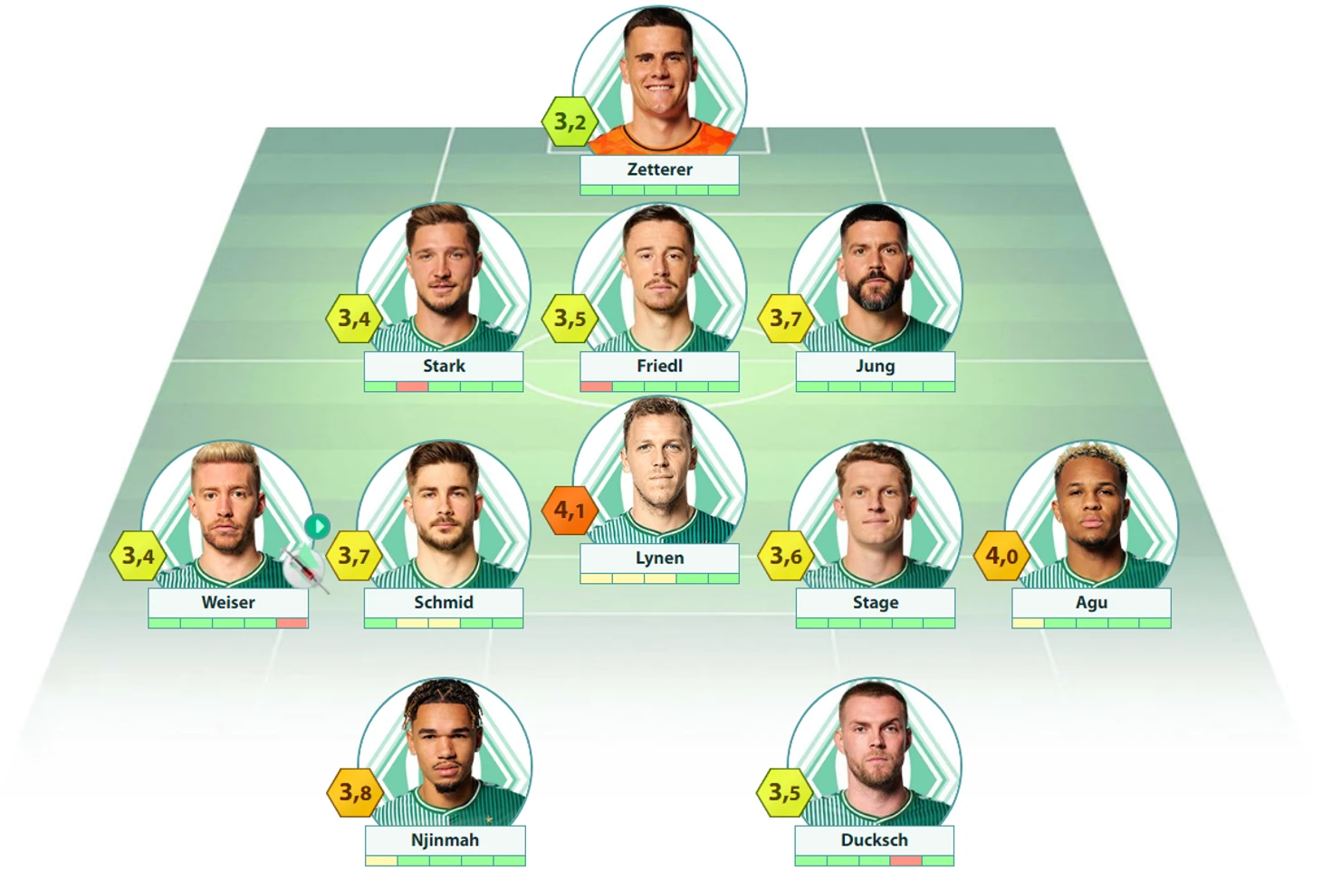 «Вердер» Бремен: Zetterer - Stark, Friedl (c), Jung - Lynen - Weiser, Schmid, Stage, Agu - Njinmah, Ducksch