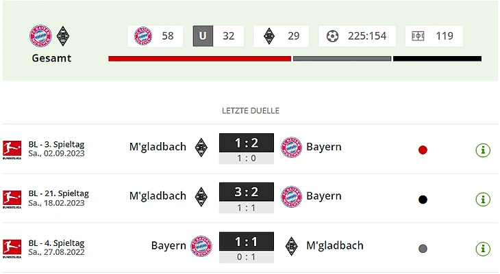 - В последний раз «Бавария» выиграла обе игры сезона против «Боруссии Менхенгладбах» в сезоне 2016/17. С тех пор «Баварии» не удавалось дважды в сезоне обыграть «жеребят» в рамках чемпионата Германии.