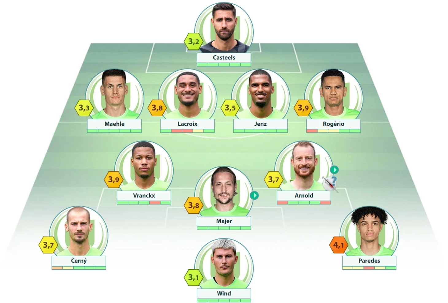 «Вольфсбург»: Casteels - Maehle, Lacroix, Jenz, Rogério - Svanberg, Vranckx - Černý, Majer, Paredes - Wind
