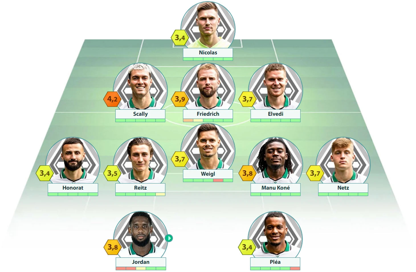 «Боруссия» Менхенгладбах: Nicolas - Scally, Elvedi, Wöber - Honorat, Reitz, Weigl (c), Koné, Netz - Jordan, Pléa