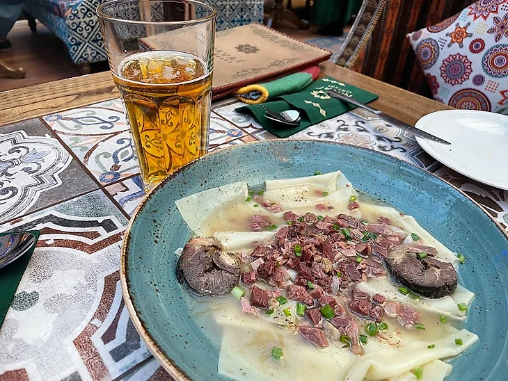 Меню разнообразное и большое. Под конец уже забыл, что выбрал и где это в меню, чтобы показать при заказе. Попробовал: Самса - 90 сом, Бешбармак по-таласски с кониной и казы- 450 сом, Плов праздничный - 345 сом, Куурдук с курицей - 480 сом , Пиво - 150 сом.