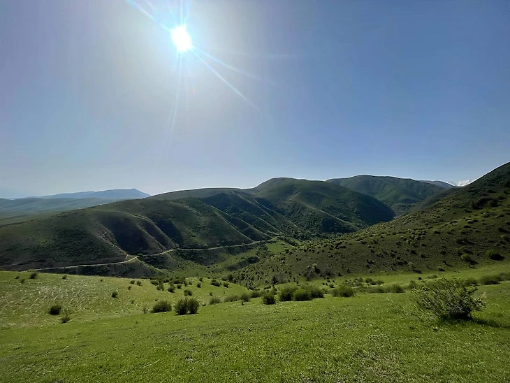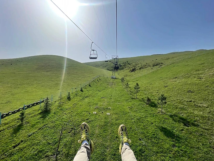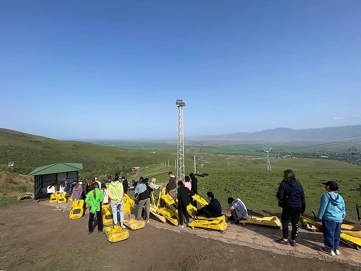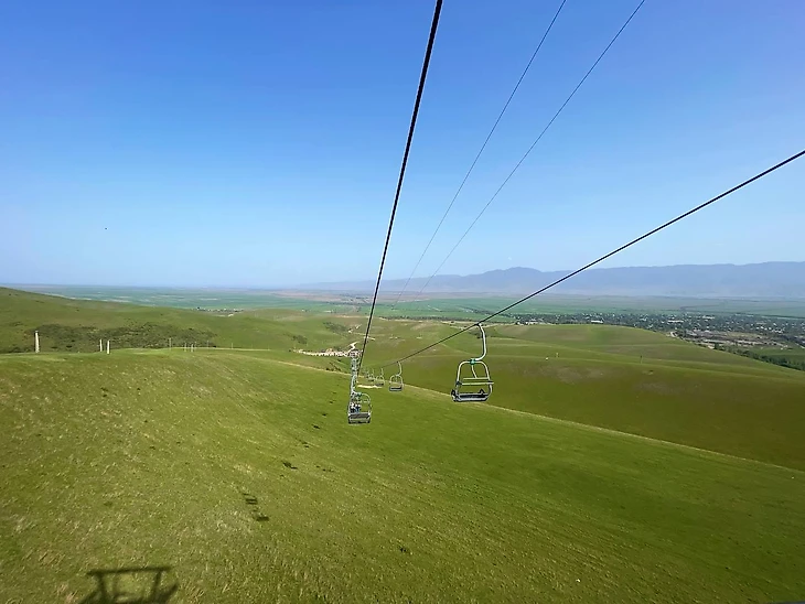 По пути на каньоны рекомендую заехать в Орловку на горнолыжную базу, чтобы скатиться с горы на родельбане. Зимой тут горнолыжная база, а в начале апреля открывается летний аттракцион «Родельбан». Стоимость 300 сом за один спуск. На высоту 1160 метров вы поднимаетесь на канатной дороге, а затем вас ждет спуск на родельбане по трассе 860 метров - самой длинной в Кыргызстане. У меня спуск занял 2,5 минуты.