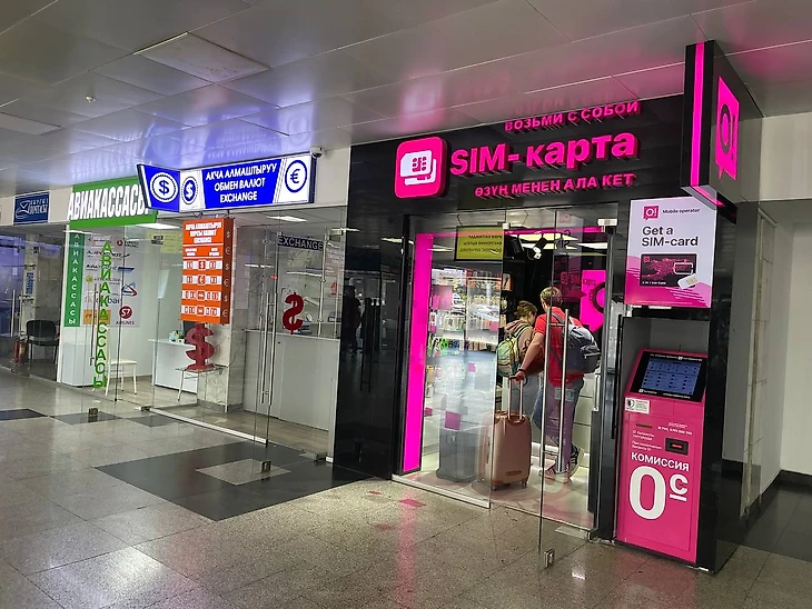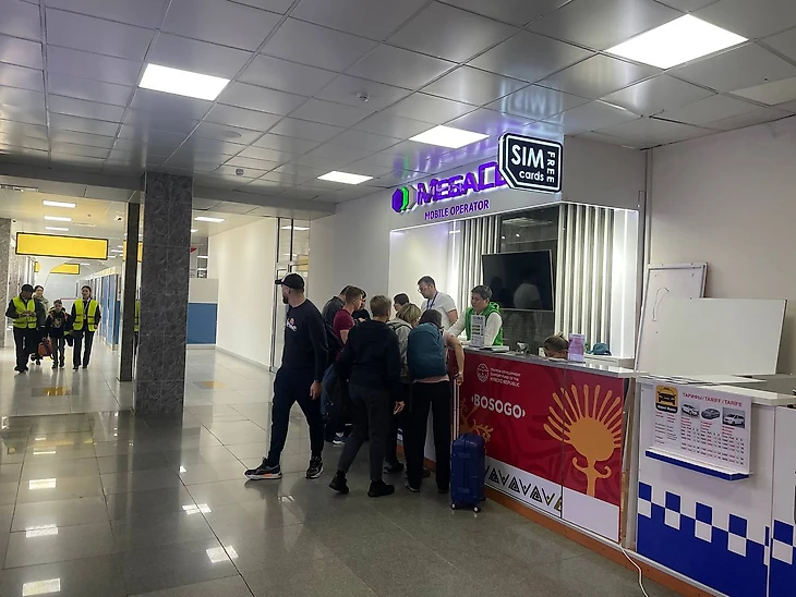 После прохождения паспортного контроля в аэропорту Бишкека, вам, скорее всего, дадут бесплатную симку с самым дешевым тарифом и ограниченным сроком действия, но лучше, тут же, по прилёту зайти в салон связи и купить себе симку с нужным тарифом. Операторы: О!, Мегаком, Билайн. Тарифы с безлимитным интернетом: на 1 неделю или на 4 недели. На 1 неделю стоит 250 KGS ( 220 руб). Цены везде одинаковые, так что выбирайте, где меньше людей в очереди скопилось.