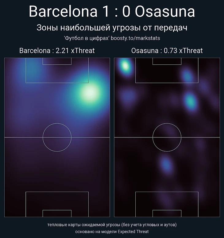 «Осасуна» строила весь свой план вокруг удержания счёта и минимизации рисков – атаки всегда начинались выносами от ворот, чтобы не подставляться под прессинг «Барселоны». В результате у каталонцев всего 2 высоких возврата мяча.