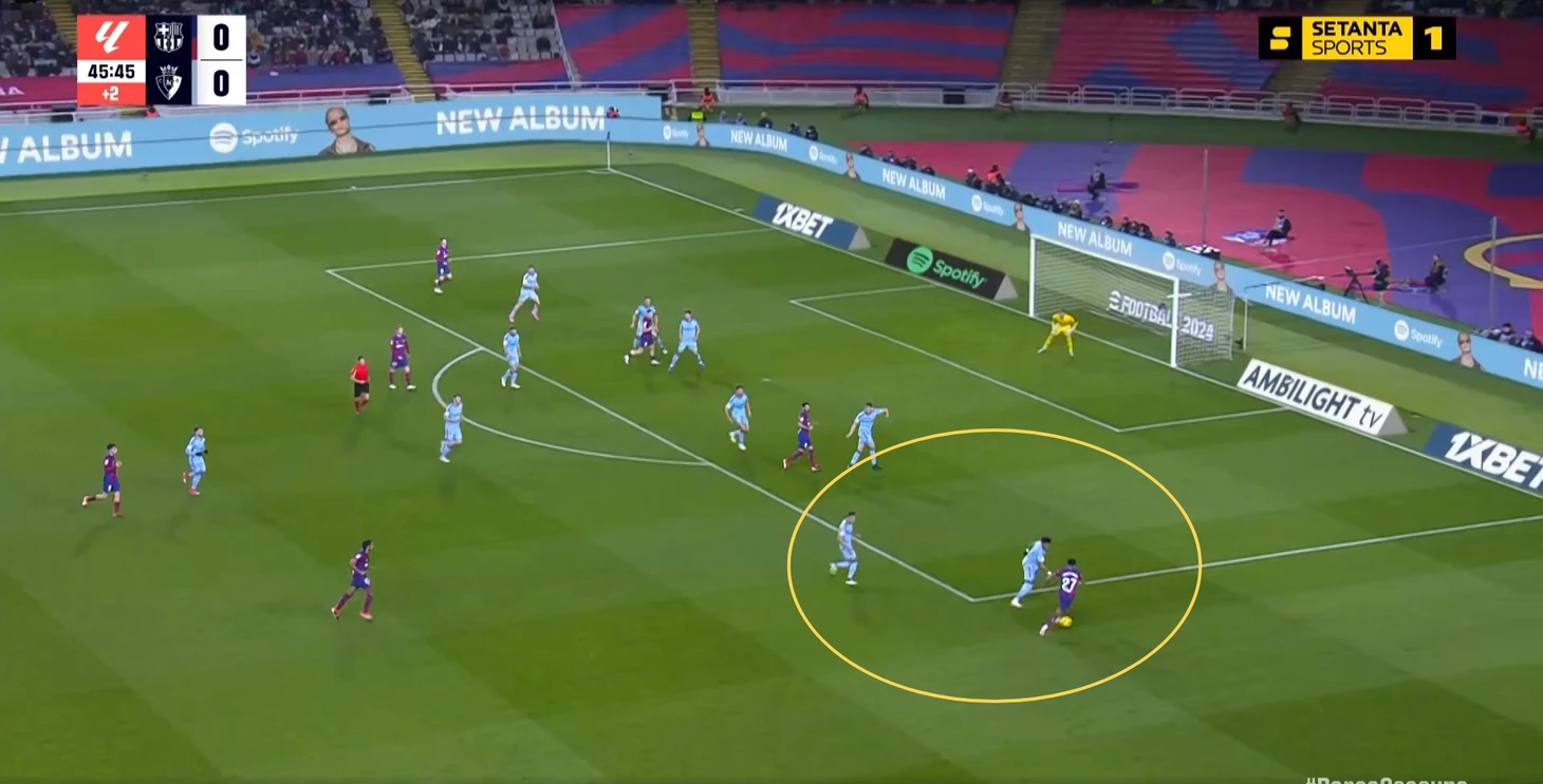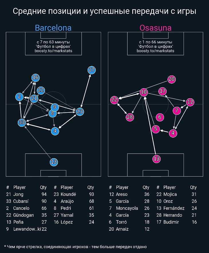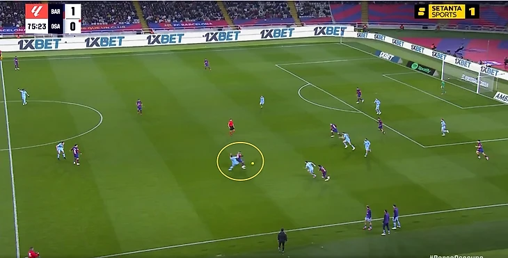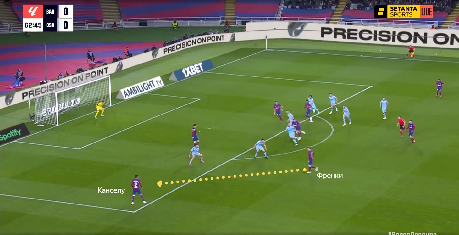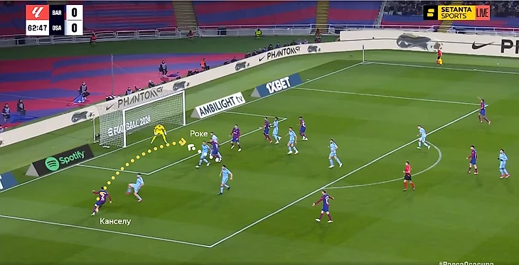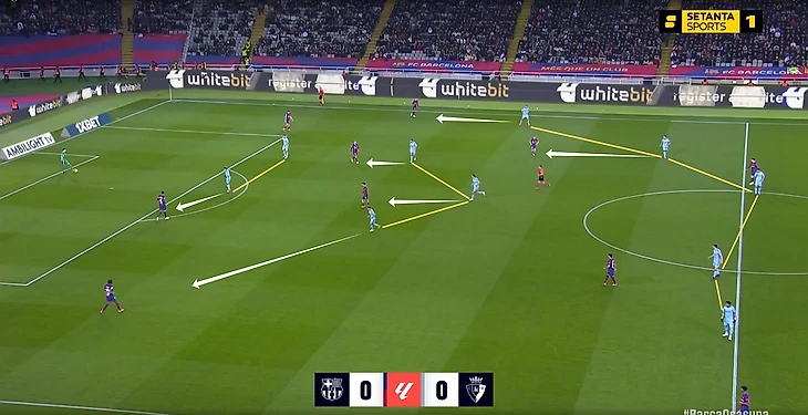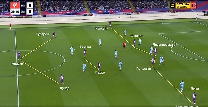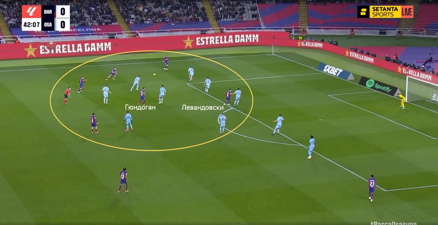 Кубарси сейчас в лучшей форме, чем Кристенсен. Канселу даёт намного больше атаке, чем Форт. Феликс травмирован, что упрощало выбор игрока на позицию в левый полуфланг. Хотя и со здоровым Жоау ожидал бы увидеть Феррана. У «Осасуны» есть такая особенность – они часто поднимают защитную линию (не прижимаются всем составом к воротам), но не идут до конца в прессинг.