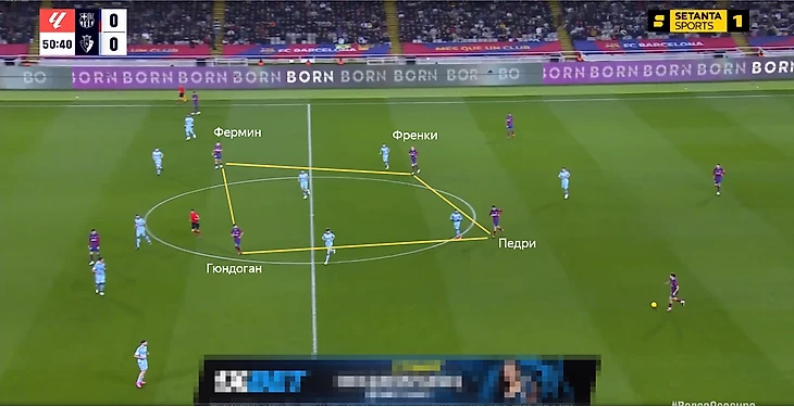 При этом нельзя сказать, что у «Барселоны» появилось большое количество моментов – с этим по-прежнему были трудности. Из-за большого количества травм у Хави не так много опций для усиления по ходу встреч, поэтому он пытался как-то разнообразить игру теми, кто уже был на поле. Например, менял позициями футболистов в квадрате в центре поля.