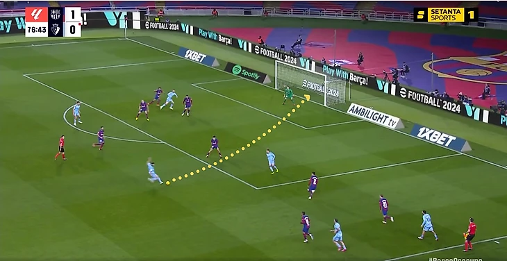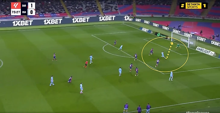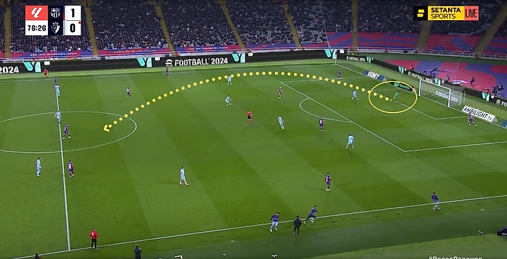 Ламин Ямал, который располагался в широкой позиции тоже имел трудности (особенно на фоне прошлых удачных матчей) – сказался тот факт, что предыдущие соперники («Бетис», «Атлетик», «Вильярреал») не оборонялись с пятёркой защитников и оставляли больше пространства на флангах. Здесь же у левого защитника Мохики постоянно была подстраховка. Плюс Кунде не всегда достаточно поддерживал Ямала подключениями по краю.