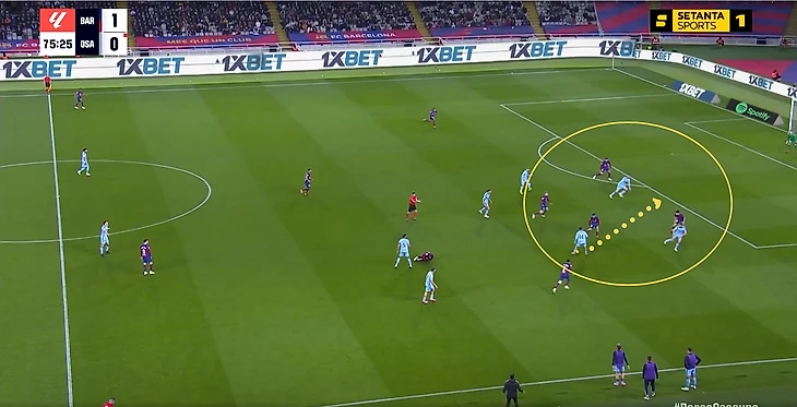У «Барселоны» часто происходила следующая ситуация: левый фланг перегружается большим количеством футболистов, а справа в изоляции остаётся Ламин Ямал (тоже отсылка к прошлому сезону).