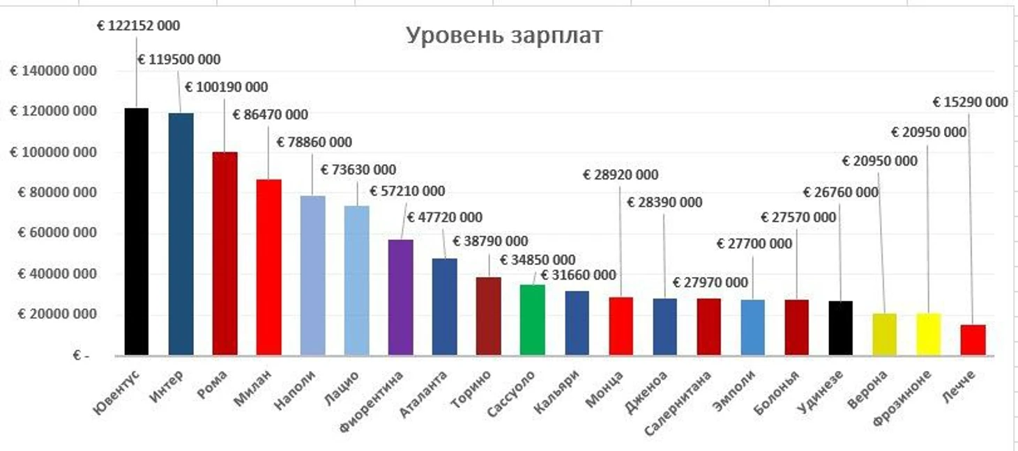 Из четырёх лидеров по зарплатам только «Ювентус» и «Милан» тратят адекватно и соизмеримо относительно своей финансовой устойчивости. Остальные имеют свои собственные проблемы в плане финансов: «Рома» не умеет правильно инвестировать, а «Интер» наоборот делает это грамотно и эффективно, но критически не соизмеримо своему положению. Конкурентноспособность команд будет зависеть от спортивного менеджмента и тренера. У «Интера» пока всё потрясающе в этом плане.