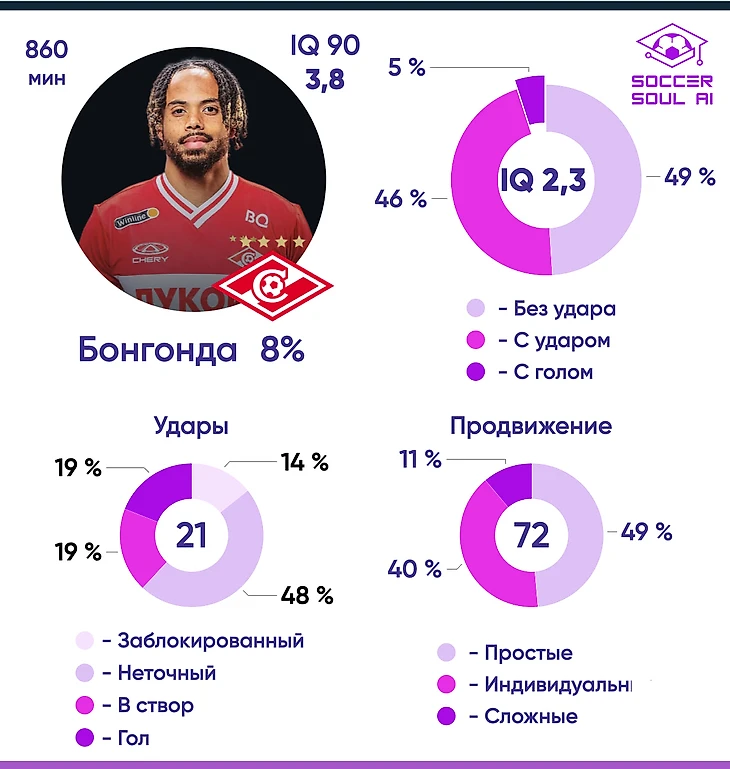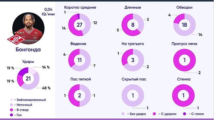 Бонгонда является ключевым игроком для Спартака. Необходим дополнительный анализ его действий в ударных атаках для понимания аномальности столь низкого показателя продвижения под гол.