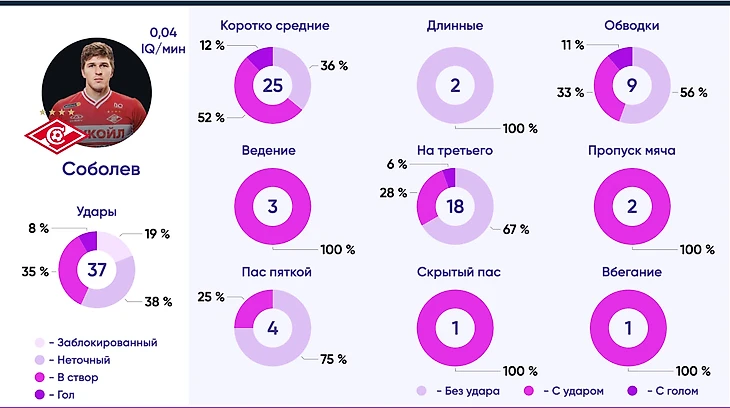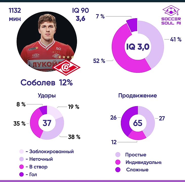 59% простых, 42% сложных и 58% индивидуальных действий Соболева в фазе продвижения мяча приходятся на атаки, завершающиеся ударами или голами, что демонстрирует универсальность в технической оснащенности игрока.