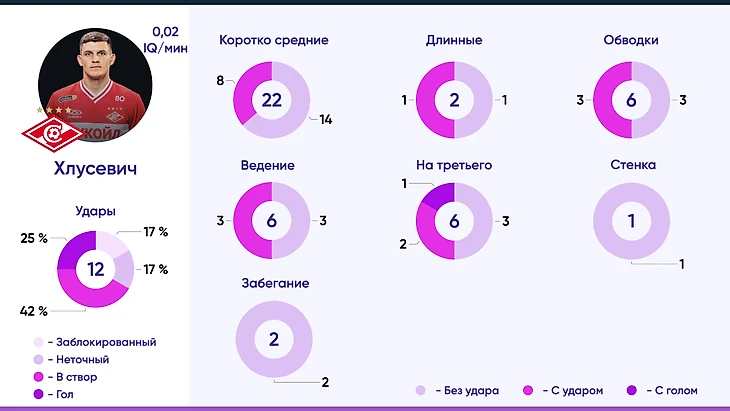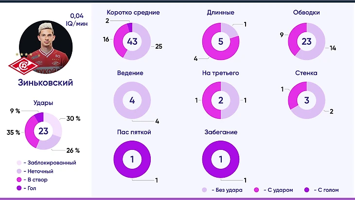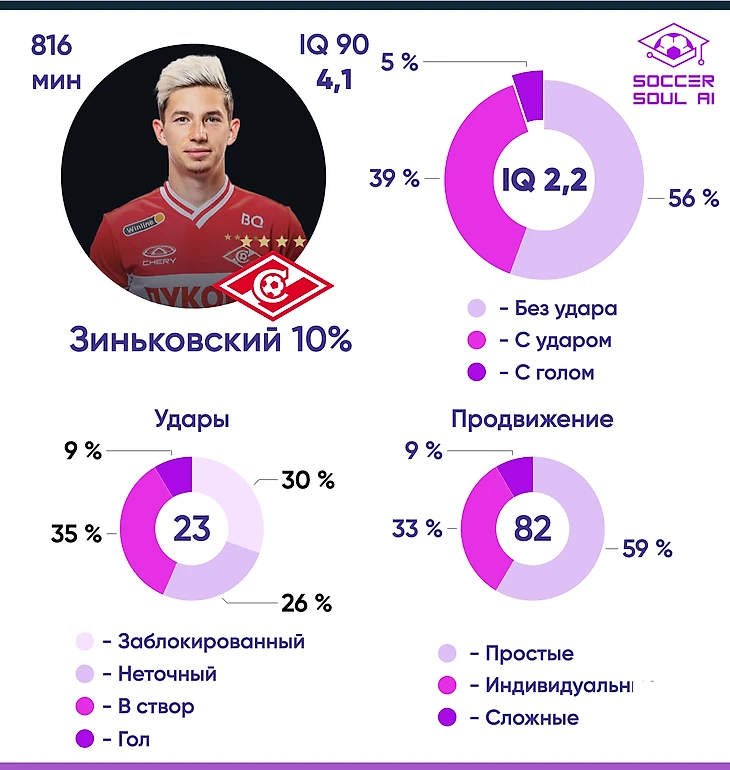 Вклад каждого из футболистов в общий командный IQ составляет 10%. Общее количество выполненных через АВП элементов выше на 15% у Зиньковского, но при этом у него на 25% выше и количество действий, не приведших к результату.