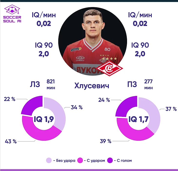 Учитывая фланговую универсальность футболиста и его средний IQ на 90 минут игры (2,0), Хлусевич является прекрасным инструментом для усиления общего командного IQ потенциала защитной линии. Правофланговый Денисов (1,1) и левофланговый Рябчук (0,5) могут быть по мере надобности им подменяемы. Кроме того, в составе имеется потенциально мега-полезный Классен, с потенциальными же IQ 6,5 на 90 минут игры, при условии, что эти 90 минут ему будут предоставлены. В общем, у Спартака есть перспективы для усиления на флангах обороны.