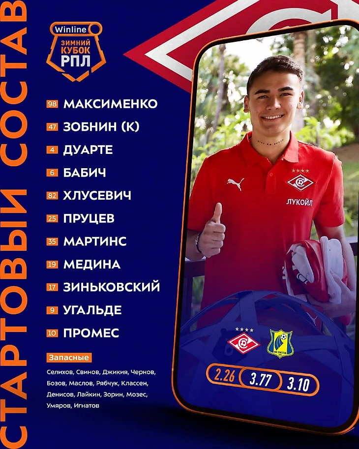 Стартовый состав московского «Спартака» на матч против «Ростова» в рамках Зимнего Кубка РПЛ-2024 Нападающий Александр Соболев пропускает матч из-за небольшого повреждения. @spartakinfo