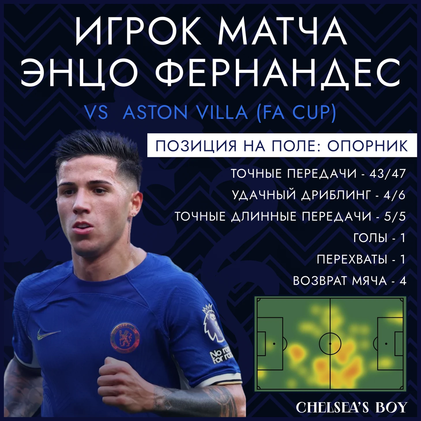 Челси провел образцовый матч, однозначно лучший в сезоне. Конечно, можно говорить, что Астон Вилла совсем «не подъехала» к игре, но это не отменяет заслуг «синих». Лучшим игроком матча становится Энцо Фернандес – его теневое влияние на игру и действия в центре поля стали одной из причин хорошей игры от Челси.