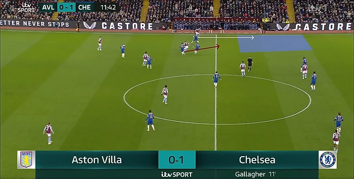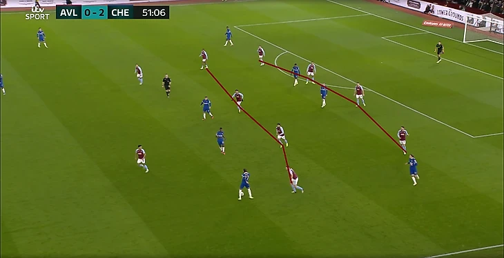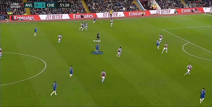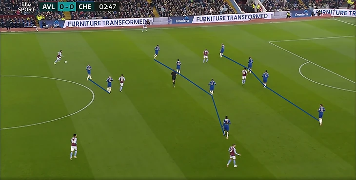 В первом тайме Челси удачно пользовался разрывами между линиями у Астон Виллы, команда хорошо играла в прессинге соперника на центральной части поля – во многом, эти два фактора и стали причиной двух забитых мячей.