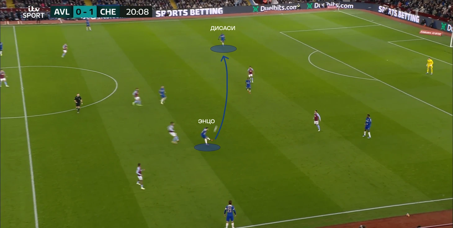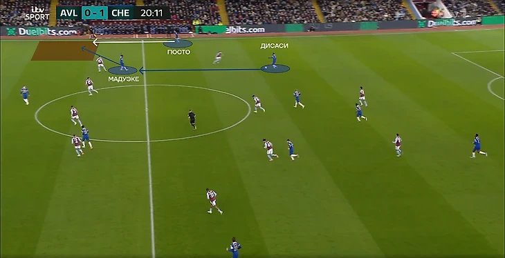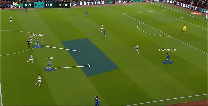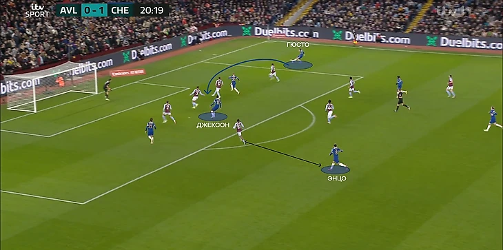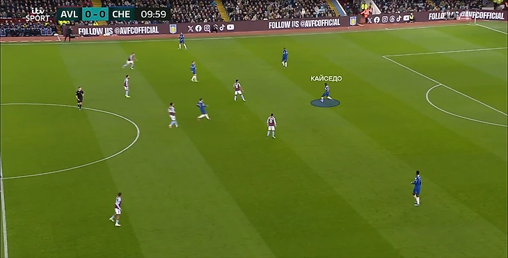Челси продолжал идею с подключением кого-то из опорных полузащитников к линии обороны, на сей раз это был Кайседо. Такая функция помогала освободить пространство в центре поля, и быстрее довести мяч до группы атаки.