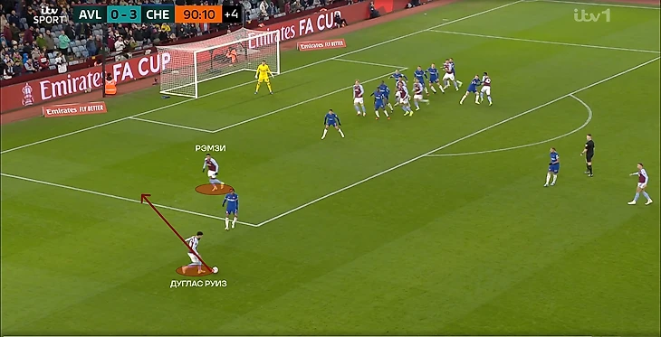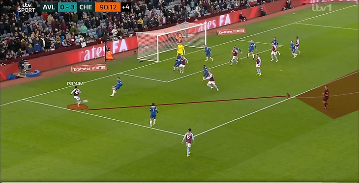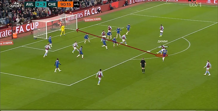 Но перспективу данной формации мы толком не смогли разглядеть – Челси пропускает гол в добавленное время. После розыгрыша углового Дуглас Диаз находит передачей Рэмзи, и Джейкоб простреливает в сторону 14-ой зоны, где находится один Диаби, который и отыгрывает один мяч.