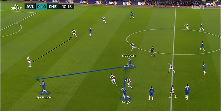 Во втором голе гостей отмечу, как Конор и Энцо выдвигались глубже для получения мяча, постепенно организуя свободные зоны для фланговых игроков «синих».