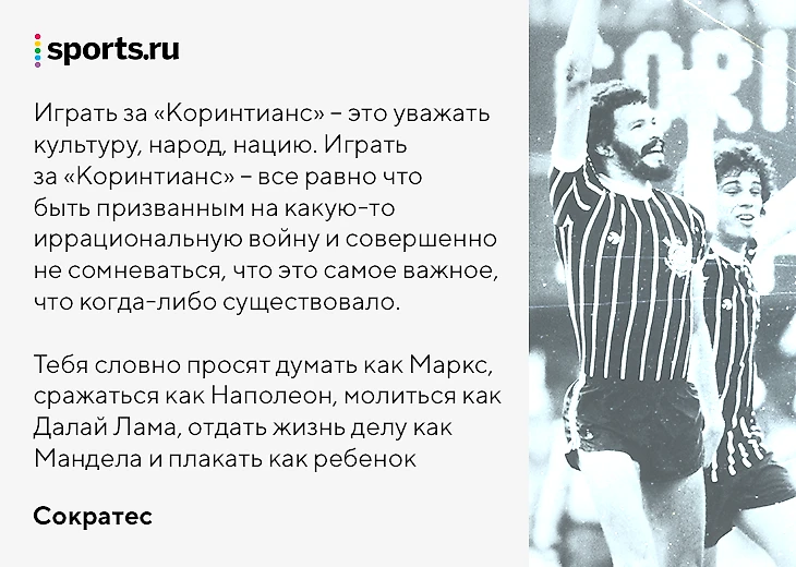 «Это была лучшая команда из всех, за которые я играл, потому что происходящее было больше спорта, – говорил Сократес. – Мои политические победы важнее побед в роли игрока. Матч длится 90 минут, а жизнь продолжается».