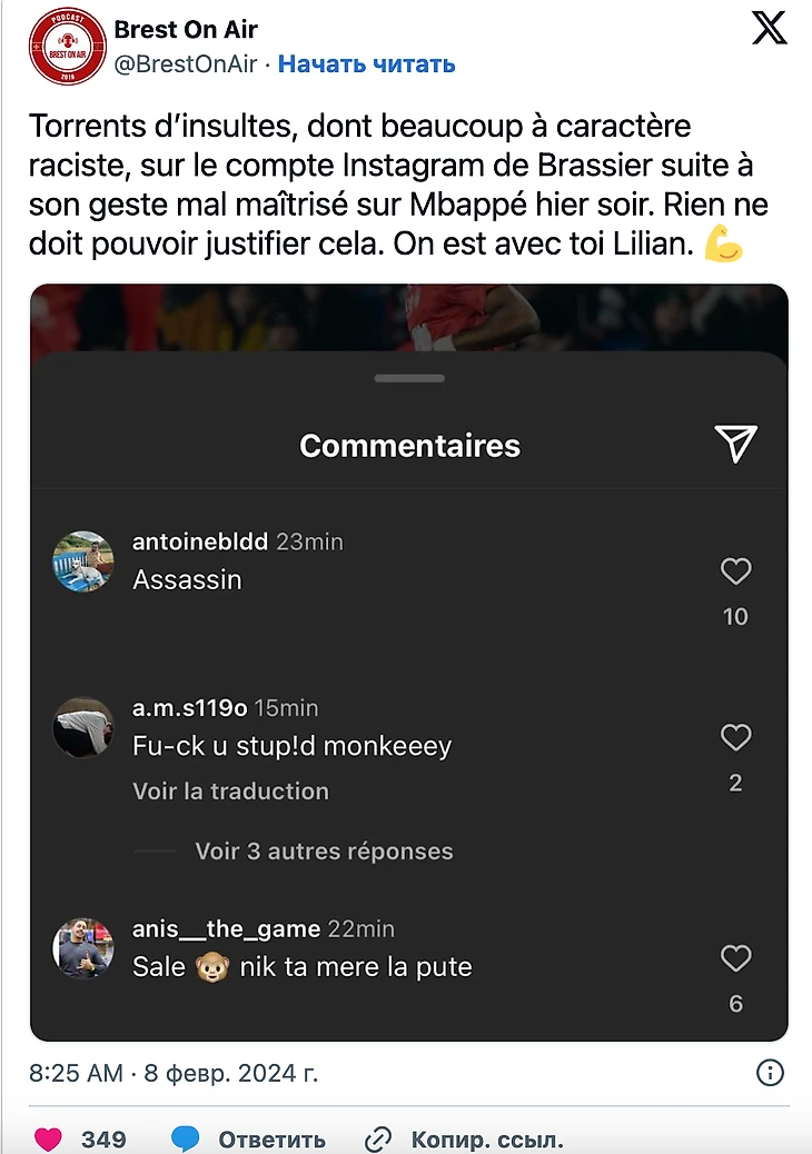 Лилиан Брассье стал жертвой шквала ненависти в своих социальных сетях после того, как в среду (3:1) в матче за выход в финал Кубка Франции против «ПСЖ» в последней игре 16-го тура, и был вынужден деактивировать комментарии на своем аккаунте в Instagram. Французский центральный защитник, в результате нарушения на 69 минуте матча получил вторую желтую карточку, означающую дисквалификацию, этот поздний подкат, привел к подвороту левой лодыжки Мбаппе, Брассье публично извинился перед чемпионом мира у микрофона France Bleu Брезиха Изеля.