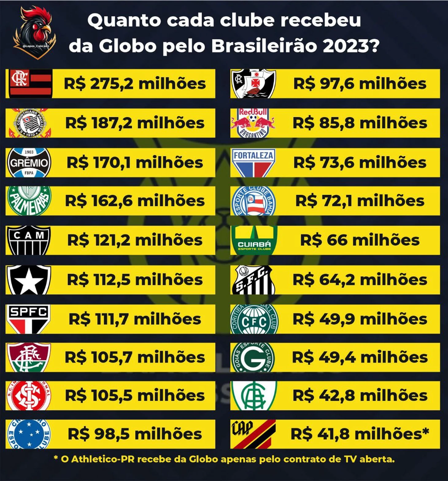 Владелец прав на трансляцию игр серии А чемпионата Бразилии, компания Globo выплатила более 2 миллиардов реалов ( порядка 400 миллионов долларов) клубам, участвовавшим в турнире 2023 года Суммы раскрыл обозреватель UOL Аллан Симон, получивший доступ к данным.